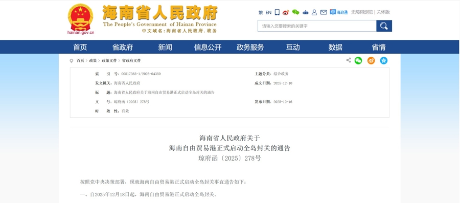今天,海南省政府对外发布通告称:按照党中央决策部署,自2025年12月18日起,海南自由贸易港正式启动全岛封关。