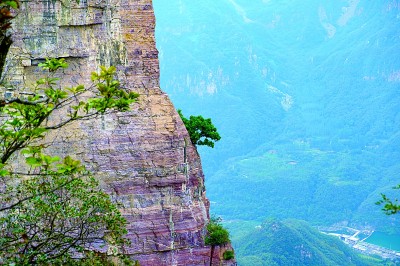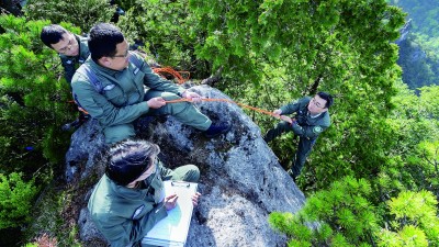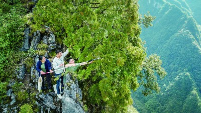 重庆雪宝山国家级自然保护区,科研人员在悬崖上调查野生崖柏。王晓宇摄/光明图片