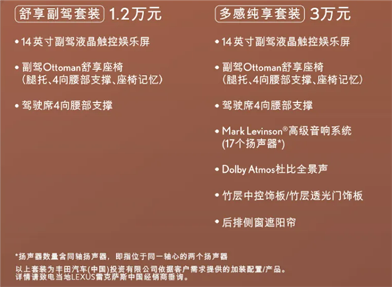 3月20日消息,全新一代雷克萨斯ES今日预售,目前仅推出ES300 h车型,价格为30.88万起,同时同步推出舒享副驾套装、多感纯享套装,价格分别为1.2万元和3万元。